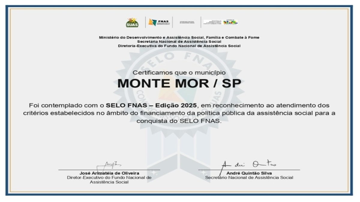 MONTE MOR CONQUISTA SELO NACIONAL DE QUALIDADE NO ATENDIMENTO SOCIAL